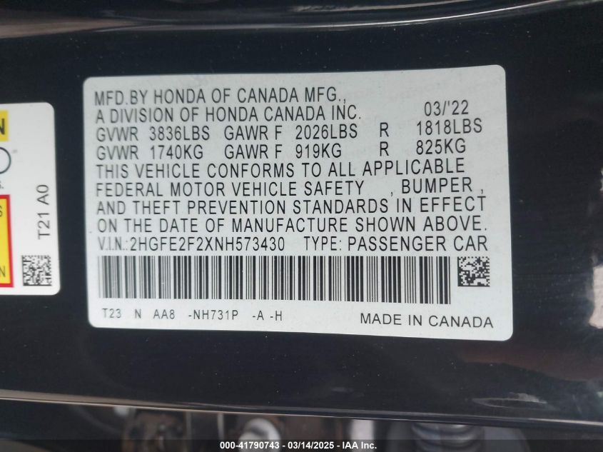 2022 HONDA CIVIC 2022 Gasoline, 2.0, Front wheel drive, VIN - 2HGFE2F2XNH****** from the USA