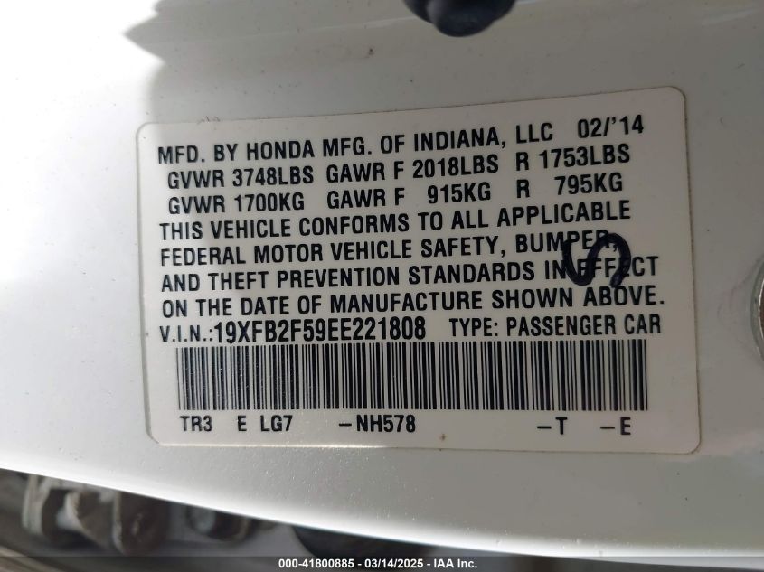 Color WhiteCylinders 4Drive Front wheel driveVIN 19XFB2F59EE******State Run & Drive VerifiedDamage Front or back AutoRIA