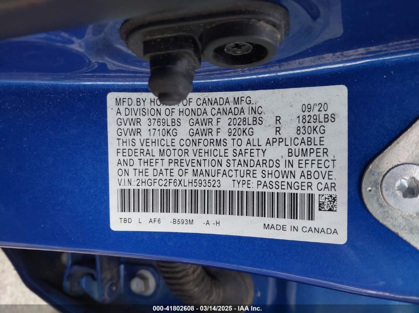 2020 HONDA CIVIC 2020 Gasoline, 2.0, Front wheel drive, VIN - 2HGFC2F6XLH****** from the USA