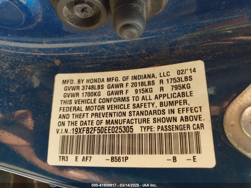Color BlueCylinders 4Drive Front wheel driveVIN 19XFB2F50EE******State Run & Drive VerifiedDamage Insignificant AutoRIA