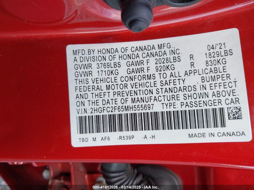 2021 HONDA CIVIC 2021 Gasoline, 2.0, Front wheel drive, VIN - 2HGFC2F65MH****** from the USA