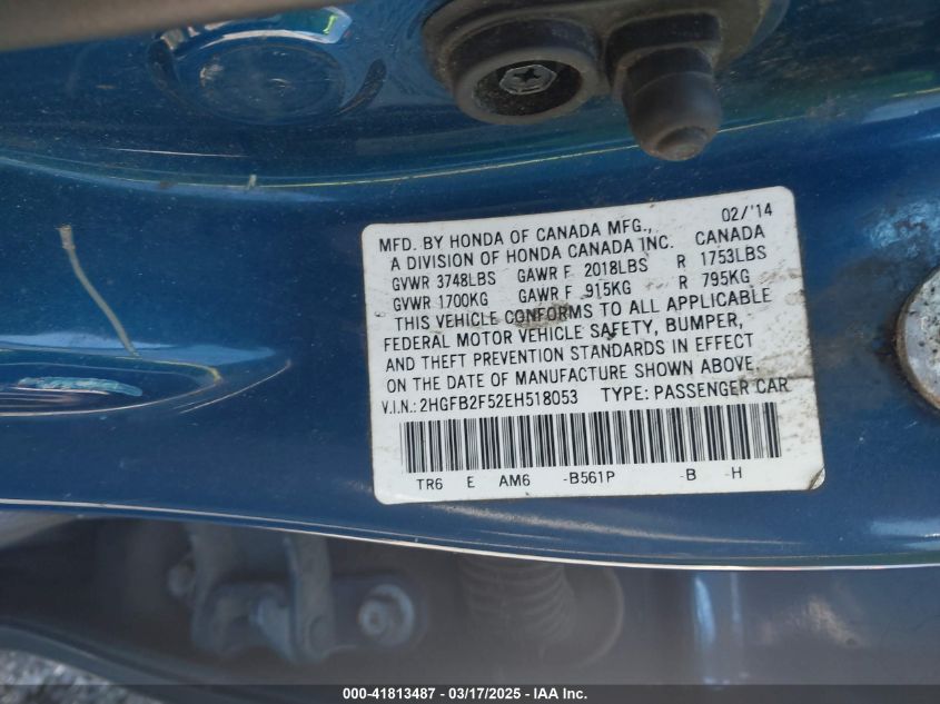 2014 HONDA CIVIC 2014 Gasoline, 1.8, Front wheel drive, VIN - 2HGFB2F52EH****** from the USA