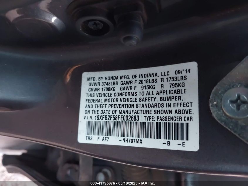 Color GrayCylinders 4Drive Front wheel driveVIN 19XFB2F58FE******State Run & Drive VerifiedDamage Front or back AutoRIA