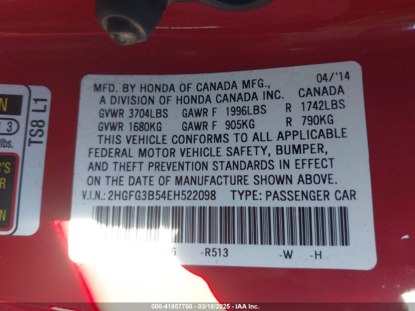 Color RedCylinders 4Drive Front wheel driveVIN 2HGFG3B54EH******State Run & Drive VerifiedDamage Front right AutoRIA