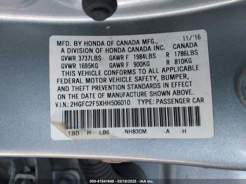 Color SilverCylinders 4Drive Front wheel driveVIN 2HGFC2F5XHH******State Run & Drive VerifiedDamage Front or backAuction date 2025-03-27 AutoRIA