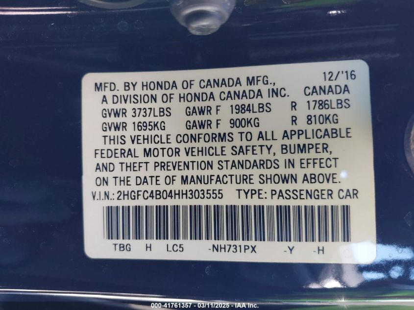 2017 HONDA CIVIC 2017 Gasoline, 2.0, Front wheel drive, VIN - 2HGFC4B04HH****** from the USA