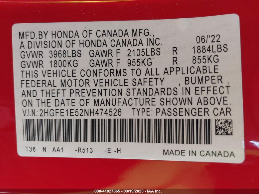 2022 HONDA CIVIC 2022 Gasoline, 1.5, Front wheel drive, VIN - 2HGFE1E52NH****** from the USA