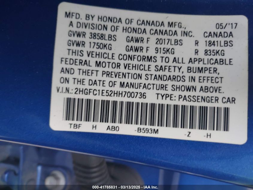 2017 HONDA CIVIC 2017 Gasoline, 1.5, Front wheel drive, VIN - 2HGFC1E52HH****** from the USA