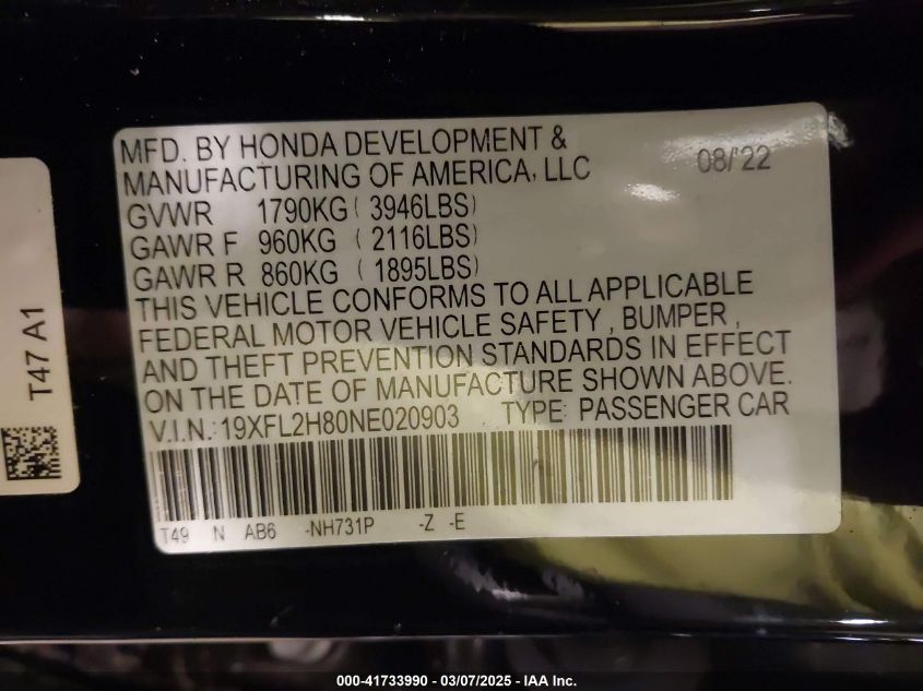 2022 HONDA CIVIC 2022 Gasoline, 2.0, Front wheel drive, VIN - 19XFL2H80NE****** from the USA