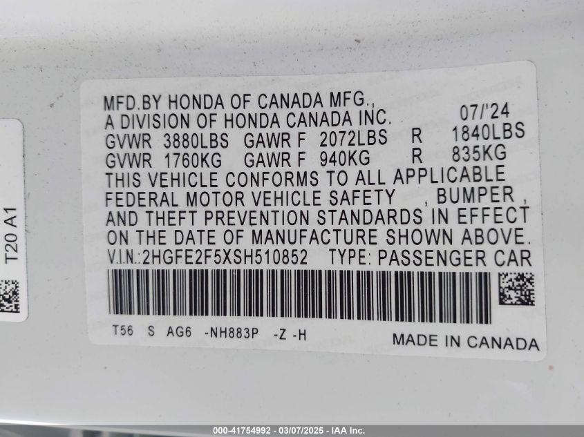 2025 HONDA CIVIC 2025 Gasoline, 2.0, Front wheel drive, VIN - 2HGFE2F5XSH****** from the USA