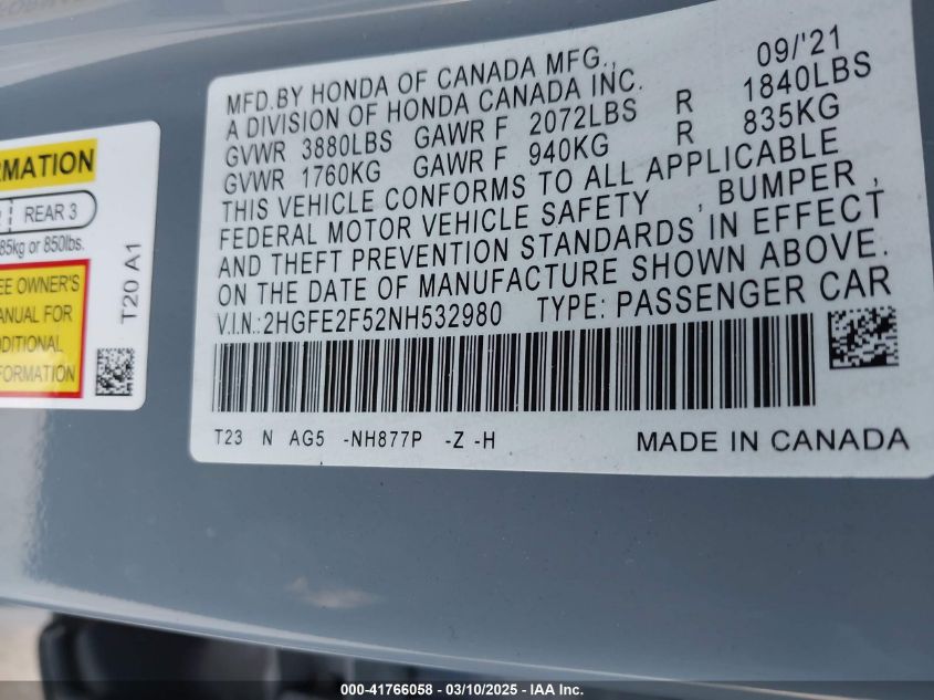 2022 HONDA CIVIC 2022 Gasoline, 2.0, Front wheel drive, VIN - 2HGFE2F52NH****** from the USA
