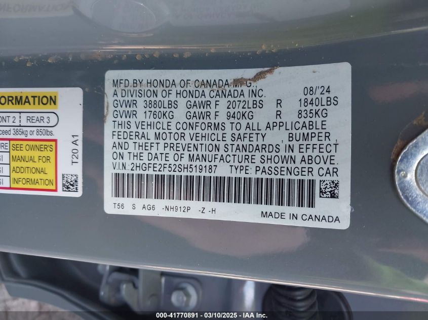 2025 HONDA CIVIC 2025 Gasoline, 2.0, Front wheel drive, VIN - 2HGFE2F52SH****** from the USA
