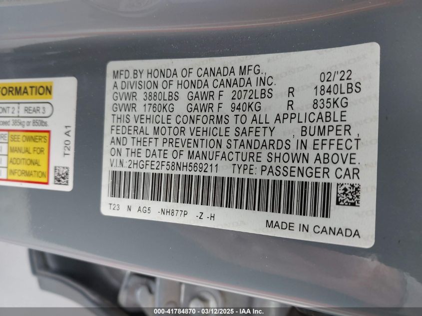 2022 HONDA CIVIC 2022 Gasoline, 2.0, Front wheel drive, VIN - 2HGFE2F58NH****** from the USA