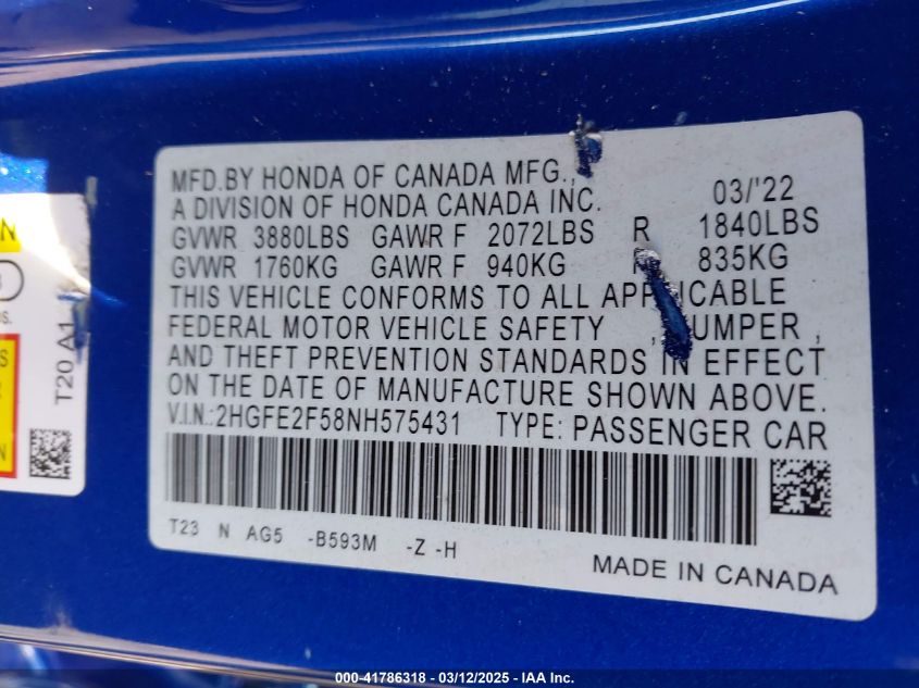 2022 HONDA CIVIC 2022 Gasoline, 2.0, Front wheel drive, VIN - 2HGFE2F58NH****** from the USA