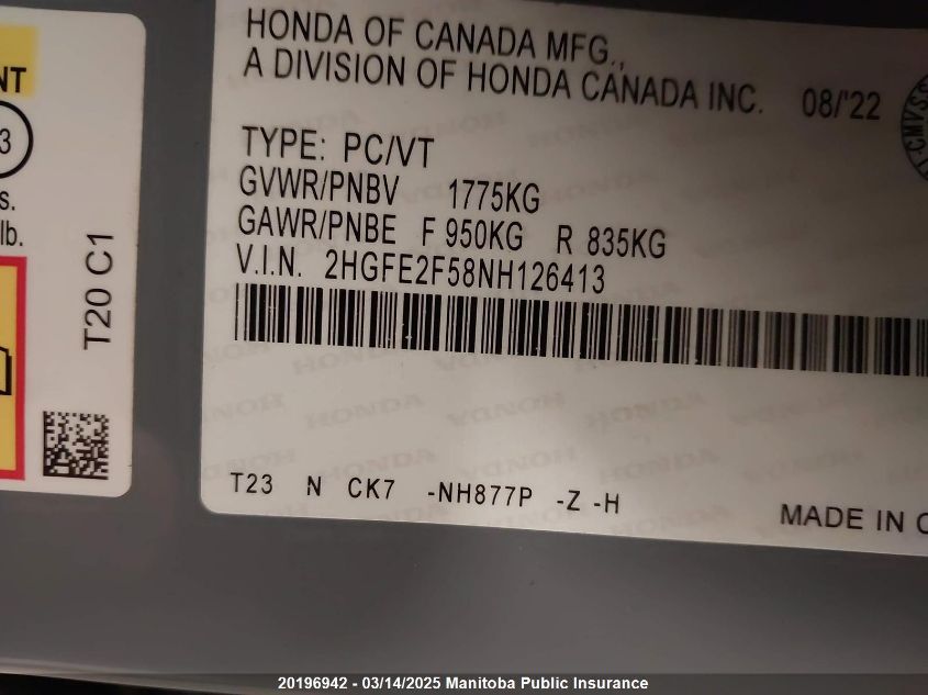 Color GrayCylinders 4Drive UnknownVIN 2HGFE2F58NH******State Run & Drive VerifiedDamage Front leftAuction date 2025-03-26 AutoRIA