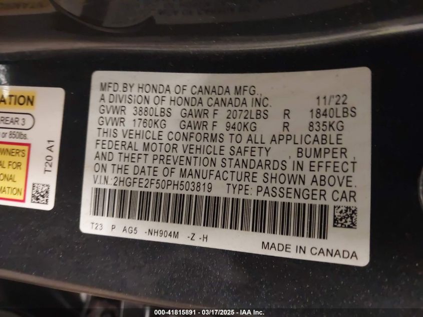 2023 HONDA CIVIC 2023 Gasoline, 2.0, Front wheel drive, VIN - 2HGFE2F50PH****** from the USA