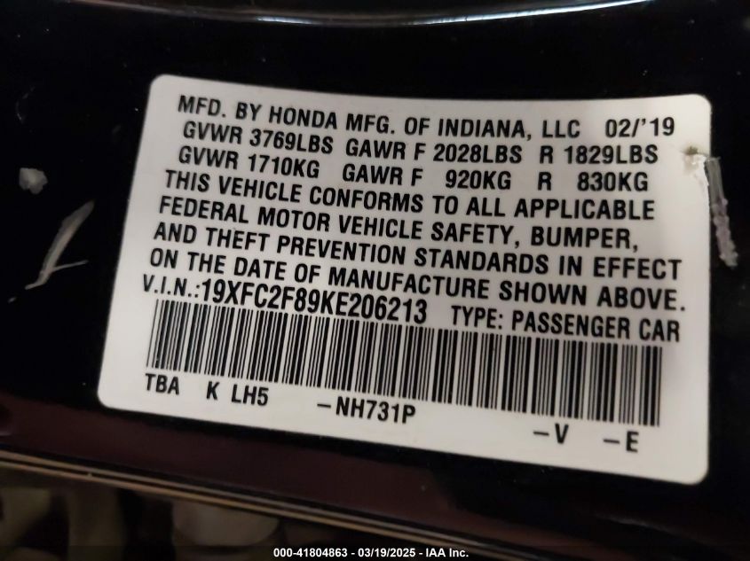 2019 HONDA CIVIC 2019 Gasoline, 2.0, Front wheel drive, VIN - 19XFC2F89KE****** from the USA