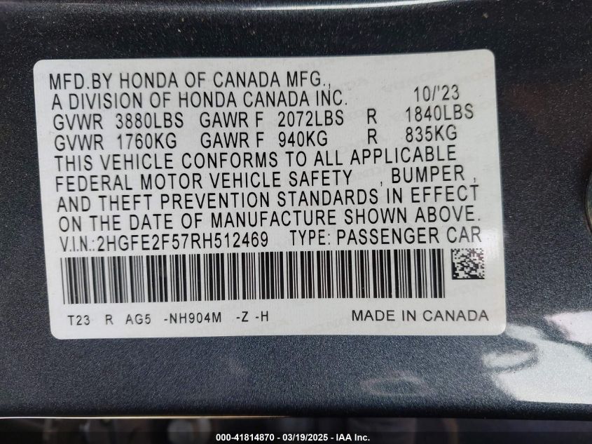 2024 HONDA CIVIC 2024 Gasoline, 2.0, Front wheel drive, VIN - 2HGFE2F57RH****** from the USA