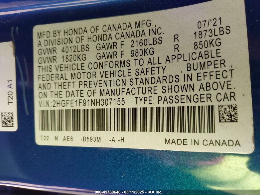 Color BlueCylinders 4Drive Front wheel driveVIN 2HGFE1F91NH******State Run & Drive VerifiedDamage Front and back AutoRIA