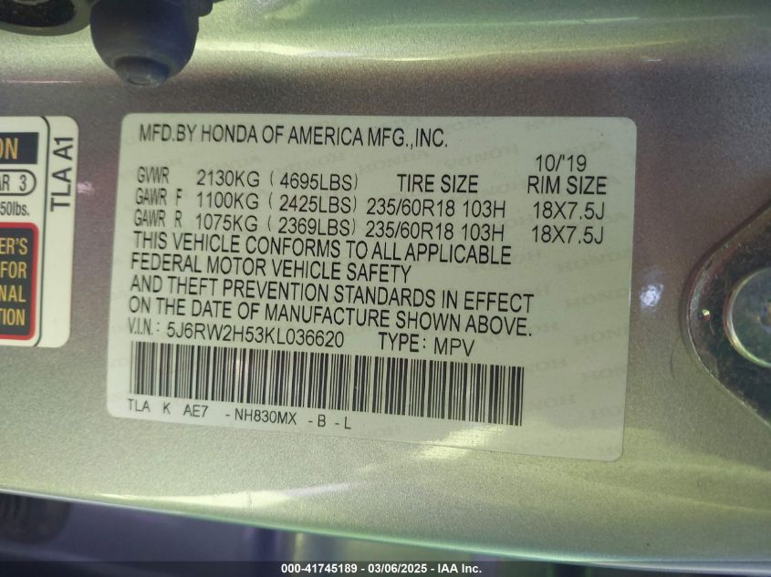 Color SilverCylinders 4Drive Full driveVIN 5J6RW2H53KL******State Run & Drive VerifiedDamage Front or back AutoRIA