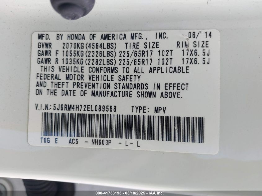Color WhiteCylinders 4Drive Full driveVIN 5J6RM4H72EL******State Run & Drive VerifiedDamage Front or back AutoRIA