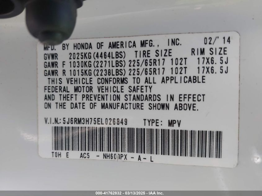 Color WhiteCylinders 4Drive Front wheel driveVIN 5J6RM3H75EL******State Run & Drive VerifiedDamage Front or back AutoRIA