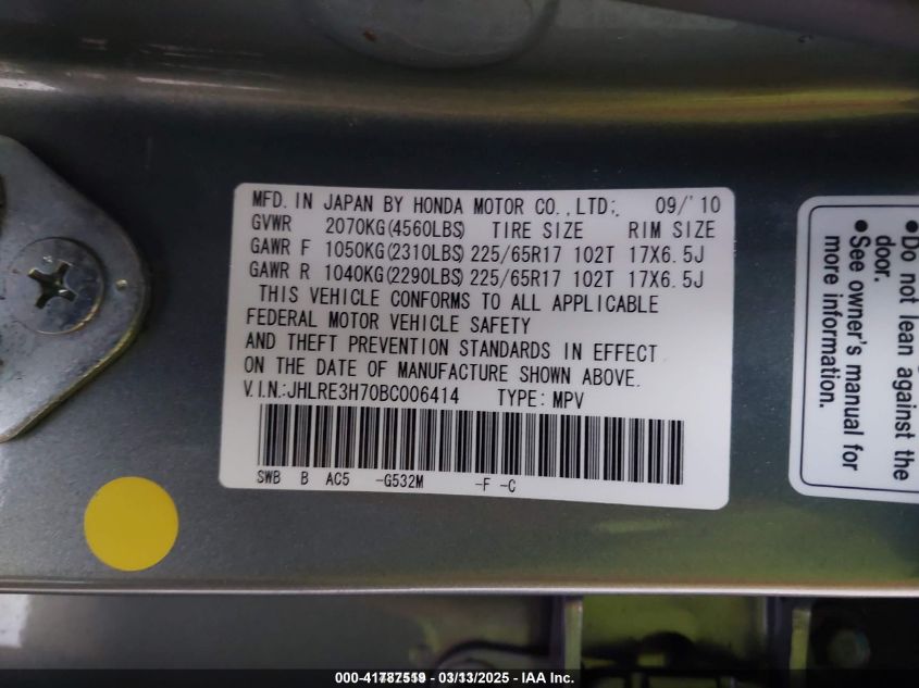 2011 HONDA CR-V 2011 Gasoline, 2.4, Front wheel drive, VIN - JHLRE3H70BC****** from the USA