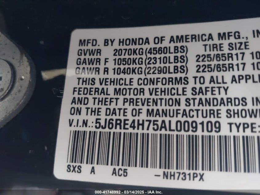 Color BlackCylinders 4Drive Full driveVIN 5J6RE4H75AL******State Run & Drive VerifiedDamage InsignificantAuction date 2025-03-20 AutoRIA