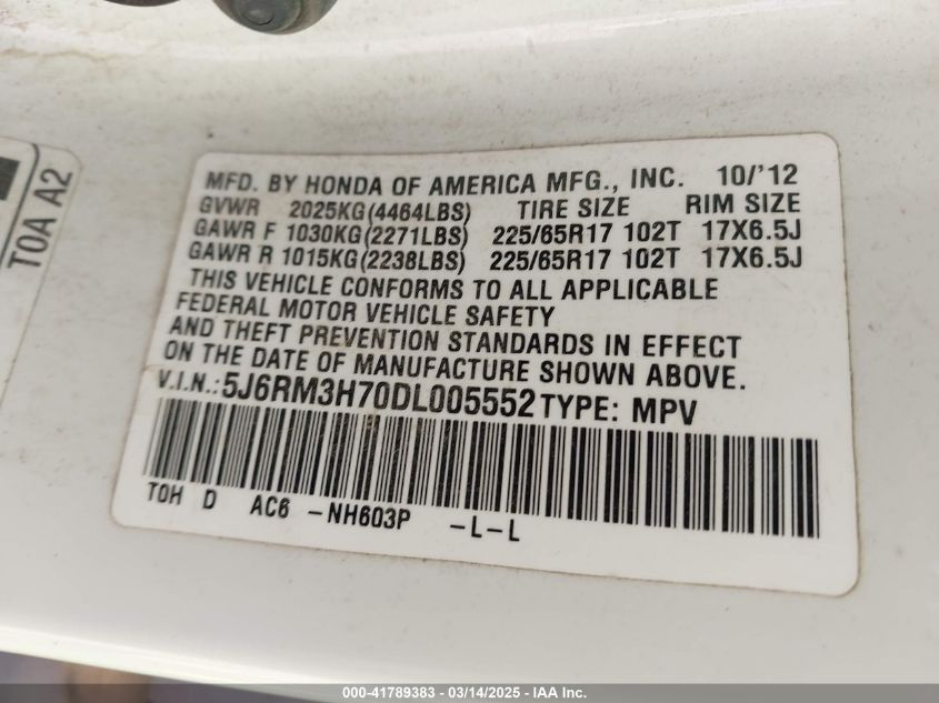 Color WhiteCylinders 4Drive Front wheel driveVIN 5J6RM3H70DL******State Run & Drive VerifiedDamage BackAuction date 2025-03-20 AutoRIA