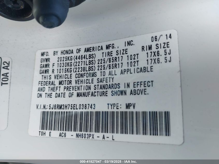 Color WhiteCylinders 4Drive Front wheel driveVIN 5J6RM3H75EL******State Run & Drive VerifiedDamage Right side AutoRIA