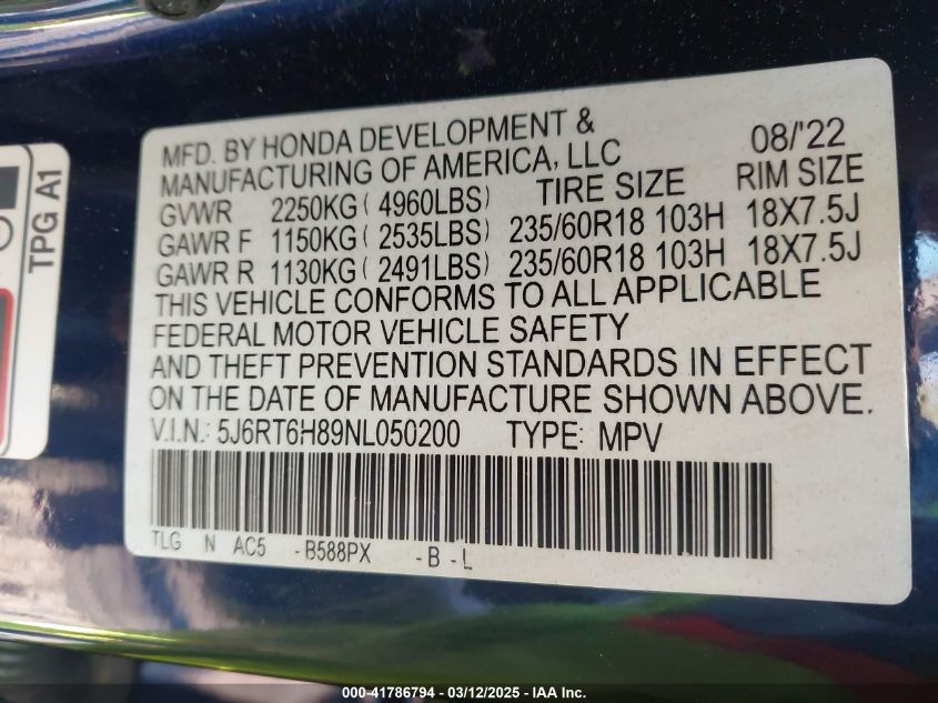 2022 HONDA CR-V HYBRID 2022 Hybrid, 2.0, Full drive, VIN - 5J6RT6H89NL****** from the USA
