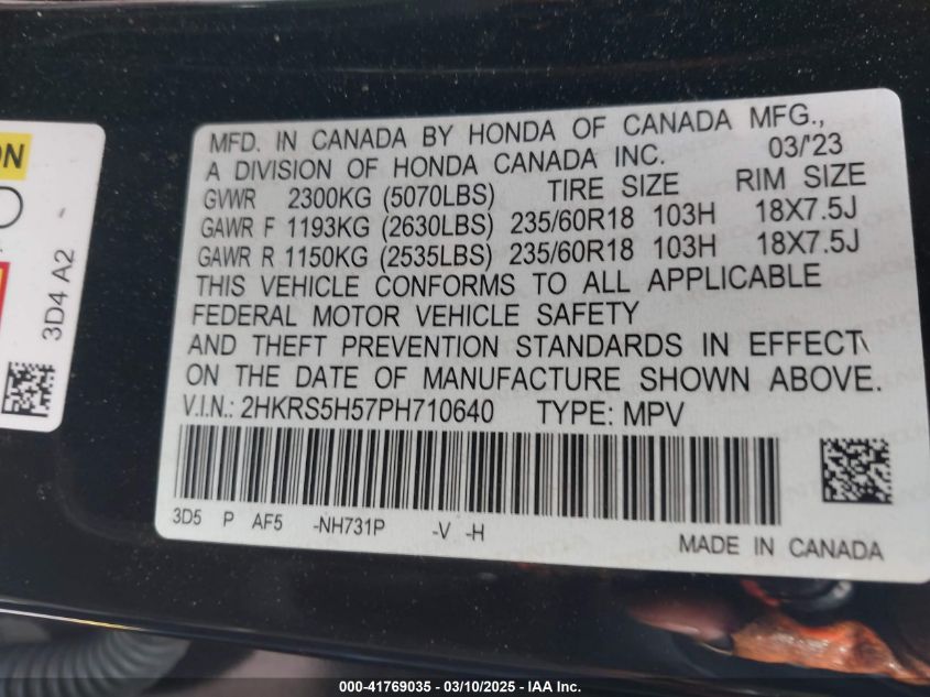2023 HONDA CR-V HYBRID 2023 Hybrid, 2.0, Front wheel drive, VIN - 2HKRS5H57PH****** from the USA
