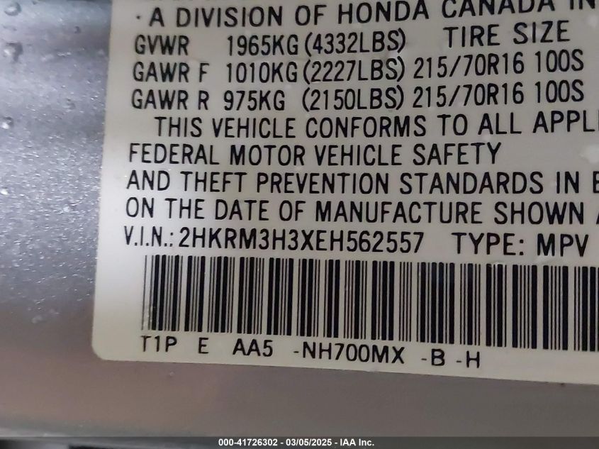 Color SilverCylinders 4Drive Front wheel driveVIN 2HKRM3H3XEH******State Run & Drive VerifiedDamage Front and backAuction date 2025-03-20 AutoRIA