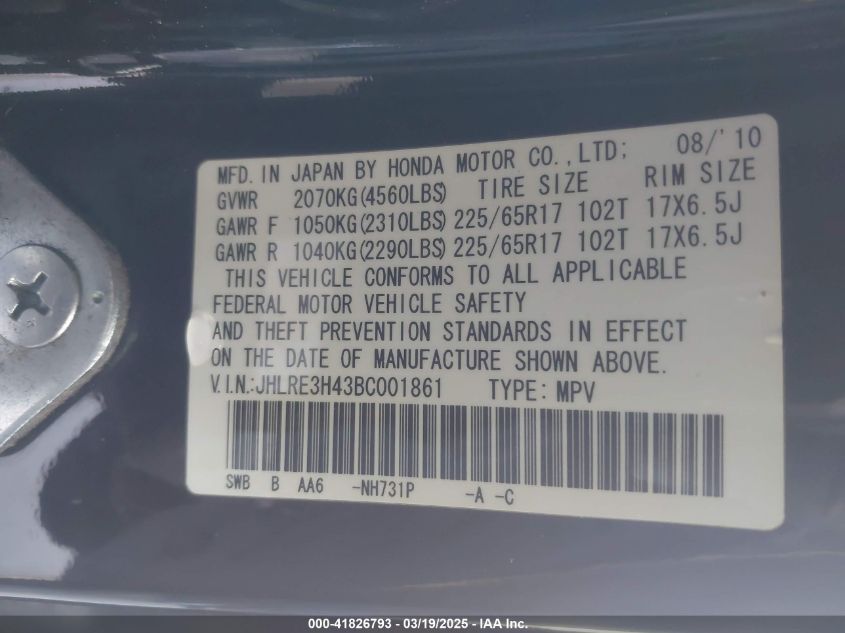 2011 HONDA CR-V 2011 Gasoline, 2.4, Front wheel drive, VIN - JHLRE3H43BC****** from the USA