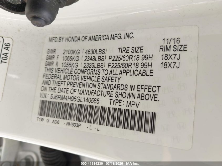 Color WhiteCylinders 4Drive Full driveVIN 5J6RM4H95GL******State Run & Drive VerifiedDamage Front right AutoRIA