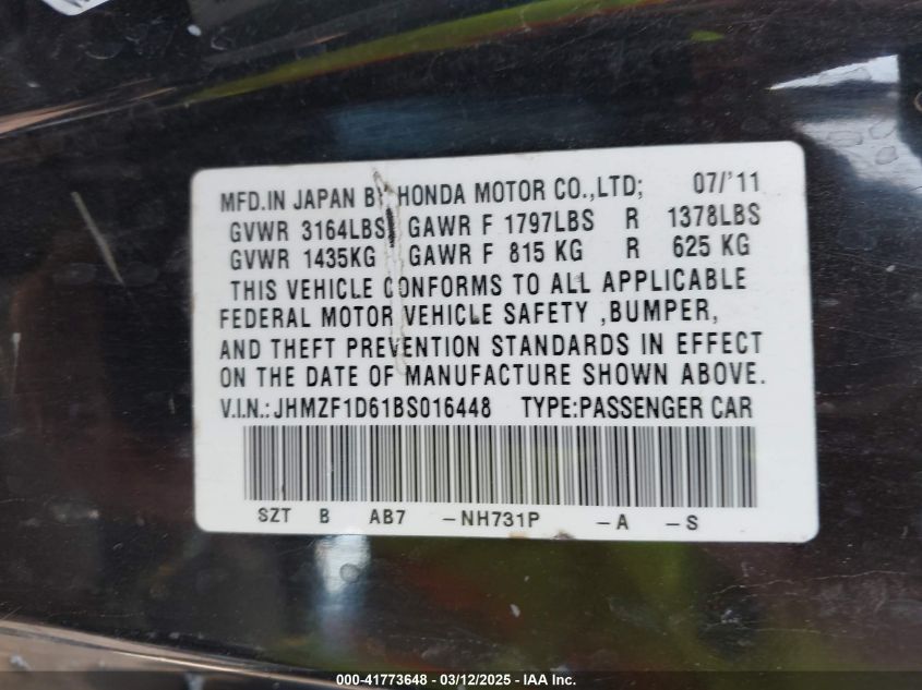 2011 HONDA CR-Z 2011 Hybrid, 1.5, Front wheel drive, VIN - JHMZF1D61BS****** from the USA