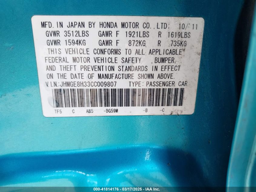 Color BlueCylinders 4Drive Front wheel driveVIN JHMGE8H33CC******State Run & Drive VerifiedDamage Front or back AutoRIA