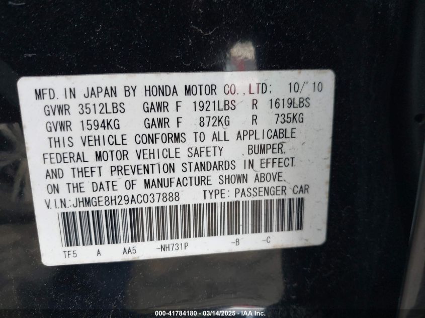 2010 HONDA FIT 2010 Gasoline, 1.5, Front wheel drive, VIN - JHMGE8H29AC****** from the USA