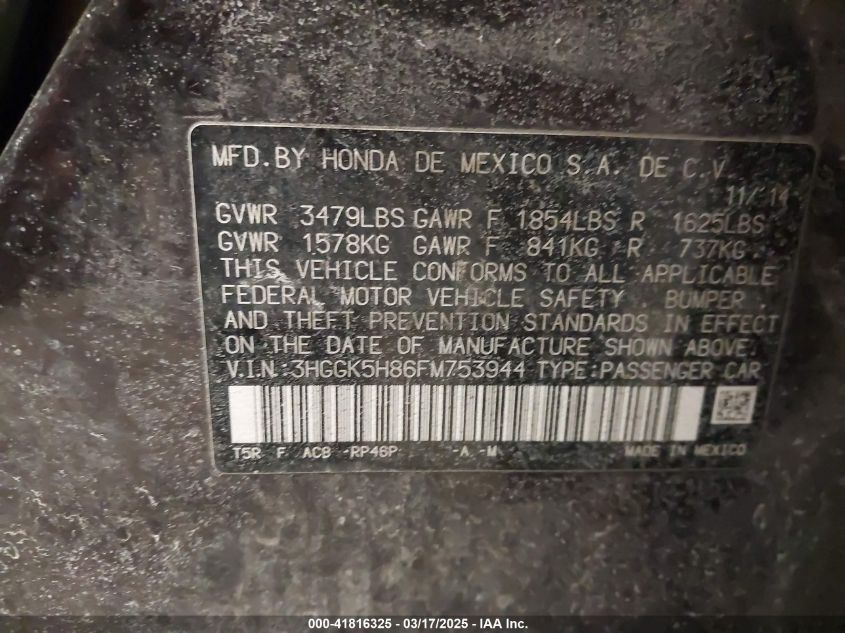 Color BurgundyCylinders 4Drive Front wheel driveVIN 3HGGK5H86FM******State Run & Drive VerifiedDamage Front left AutoRIA