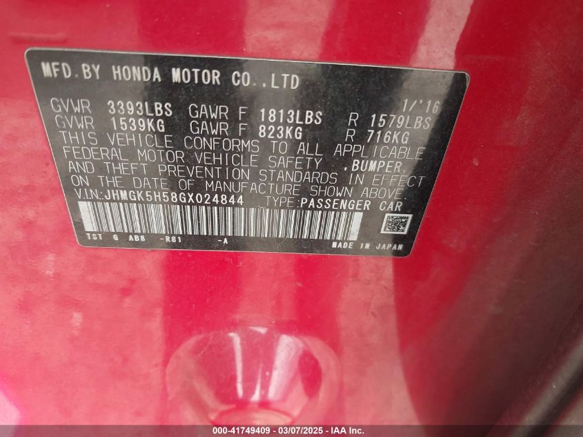Color RedCylinders 4Drive Front wheel driveVIN JHMGK5H58GX******State Run & Drive VerifiedDamage From the sidesAuction date 2025-03-24 AutoRIA