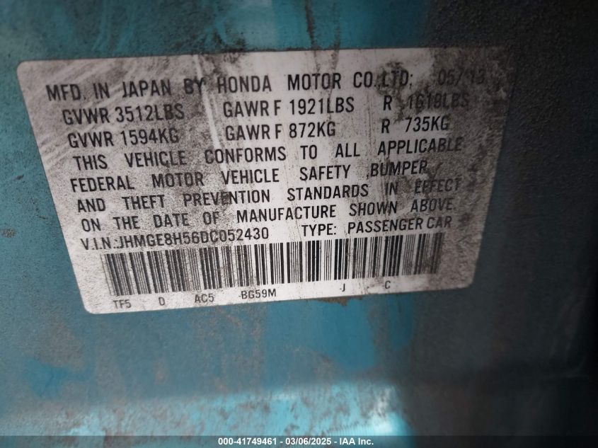 Color TurquoiseCylinders 4Drive Front wheel driveVIN JHMGE8H56DC******State Run & Drive VerifiedDamage Front or backAuction date 2025-03-21 AutoRIA