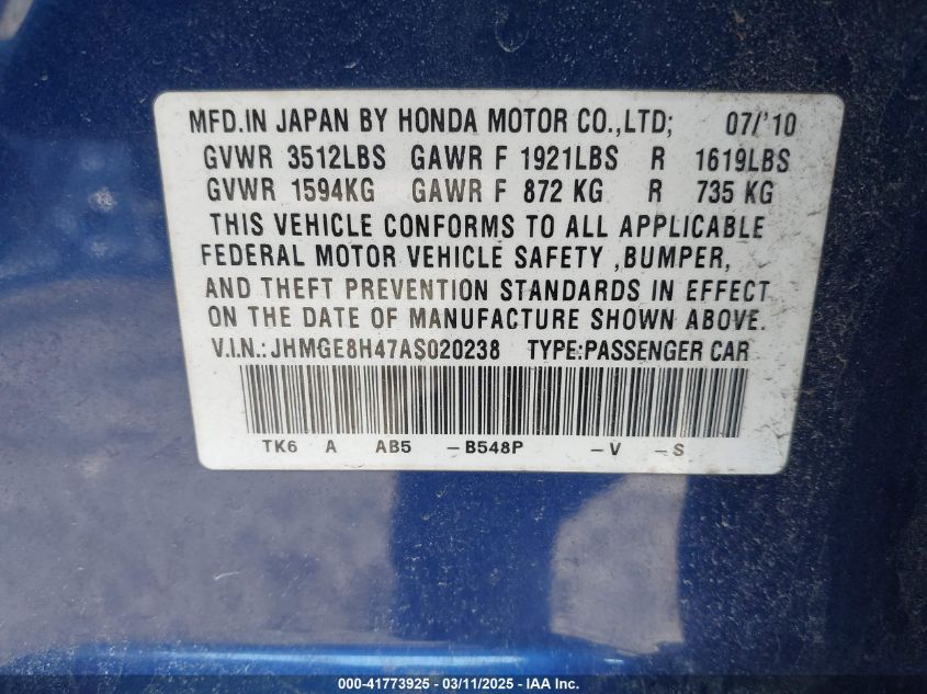 Color BlueCylinders 4Drive Front wheel driveVIN JHMGE8H47AS******State Run & Drive VerifiedDamage Right sideAuction date 2025-03-20 AutoRIA