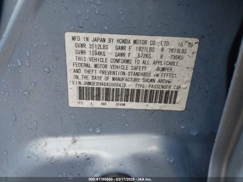 2010 HONDA FIT 2010 Gasoline, 1.5, Front wheel drive, VIN - JHMGE8H48AC****** from the USA