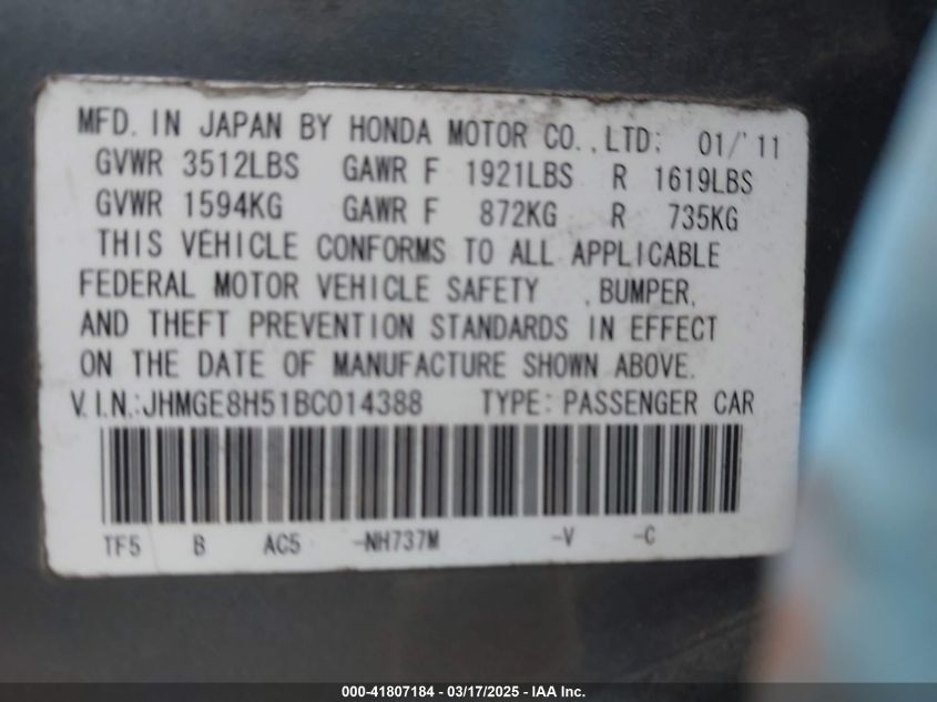 Color GrayCylinders 4Drive Front wheel driveVIN JHMGE8H51BC******State Run & Drive VerifiedDamage Front or backAuction date 2025-03-25