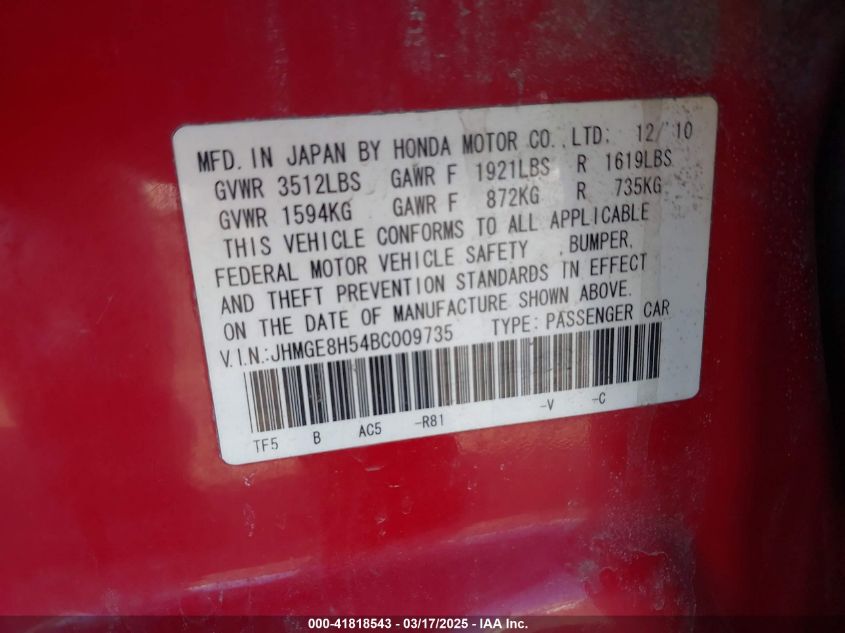 Color RedCylinders 4Drive Front wheel driveVIN JHMGE8H54BC******State Run & Drive VerifiedDamage Front right