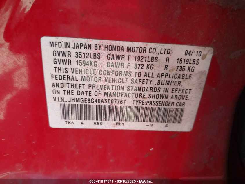 2010 HONDA FIT 2010 Gasoline, 1.5, Front wheel drive, VIN - JHMGE8G40AS****** from the USA