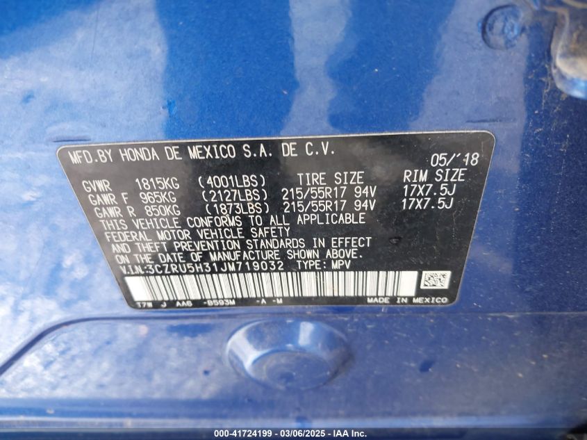 2018 HONDA HR-V 2018 Gasoline, 1.8, Front wheel drive, VIN - 3CZRU5H31JM****** from the USA