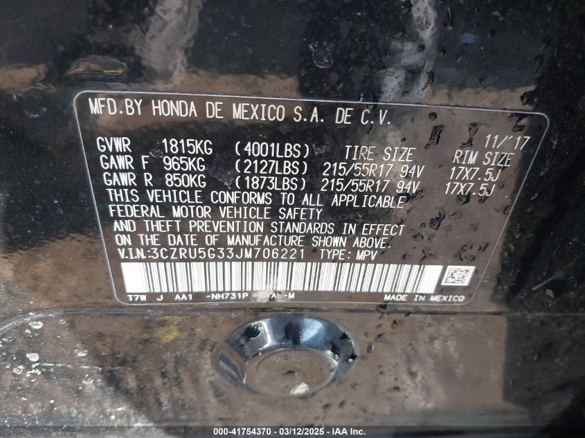 Color BlackCylinders 4Drive Front wheel driveVIN 3CZRU5G33JM******State Run & Drive VerifiedDamage Left sideAuction date 2025-03-27 AutoRIA