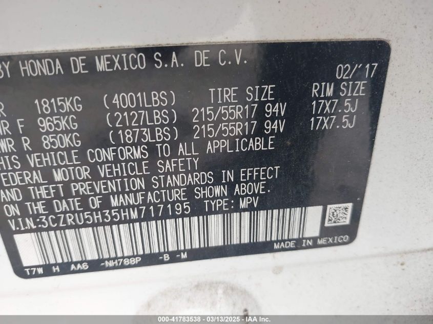 2017 HONDA HR-V 2017 Gasoline, 1.8, Front wheel drive, VIN - 3CZRU5H35HM****** from the USA