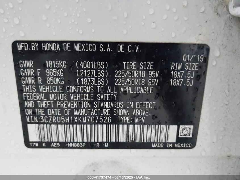 2019 HONDA HR-V 2019 Gasoline, 1.8, Front wheel drive, VIN - 3CZRU5H1XKM****** from the USA